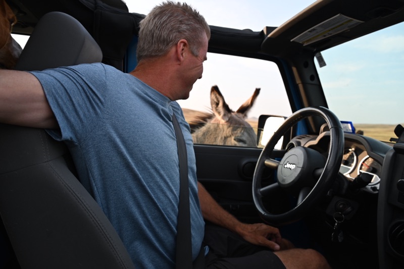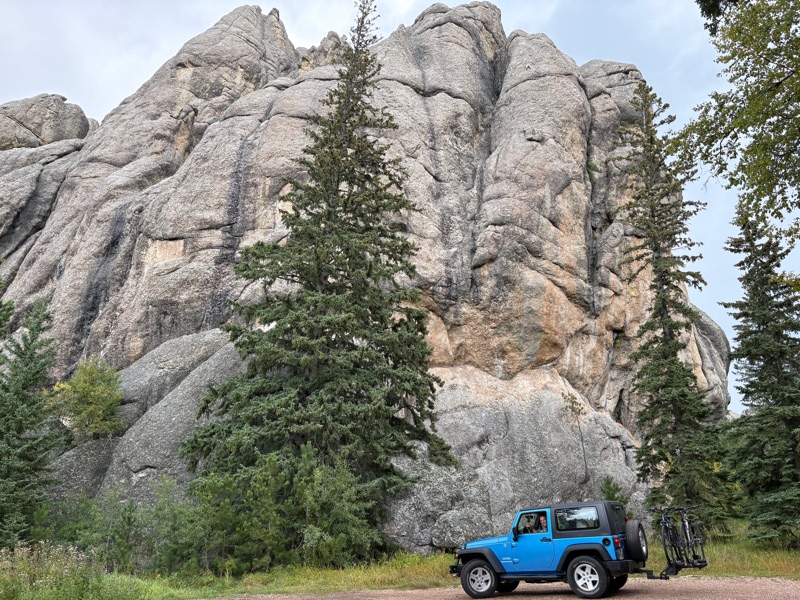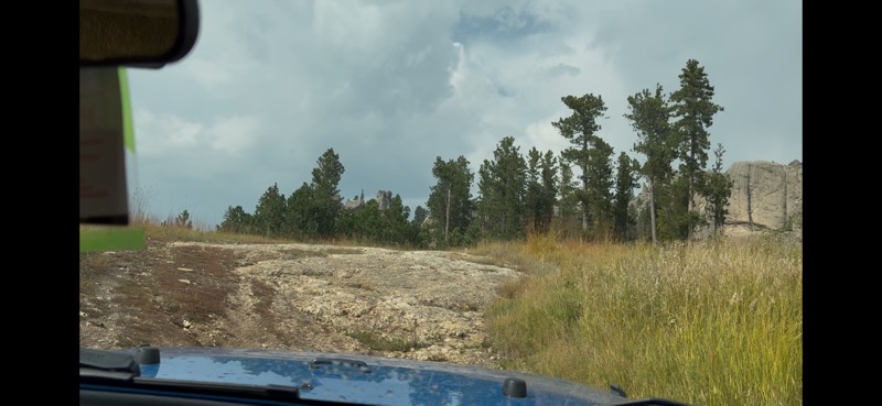 By early afternoon we were checked into our KOA in Mount Rushmore! It is set in the Black Hills with views that go on and on! Not wanting to waste a moment I convinced Dana to jump in the jeep and do the Needle Highway and the wild life loop in Custer State Park! This can be a 5 hour adventure! We would end up at LMount Rushmore for dinner and the evening light show. Our journey began by winding and weaving while climbing up past 5300 feet above sealevel! It was spectacular! The rock formations are like no other place in the world! At one point you pay to enter Needle Highway. It is at the top of this area and is often one lane going through rock tunnels! Wow! Dana has been chomping at the bit to go off roading in our newly attained jeep and without any warning pulled off onto a dirt trail that ended at rocky cliffs! I must say the jeep handled the rough terrain